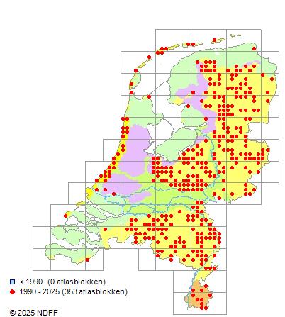 Het aantal atlasblokken (5x5 km) waarin de soort is gemeld binnen een periode van vijf jaar (vanaf 1980) of twintig jaar. Niet gecorrigeerd voor waarnemersinspanning en het aantal doorgegeven waarnemingen kan sterk variëren per periode, dus een trend in verspreiding kan hier niet direct uit worden afgelezen. Het opgegeven jaartal is het eerste jaar van de periode. Bron: gevalideerde waarnemingen uit de NDFF.