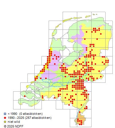 Het aantal atlasblokken (5x5 km) waarin de soort is gemeld binnen een periode van vijf jaar (vanaf 1980) of twintig jaar. Niet gecorrigeerd voor waarnemersinspanning en het aantal doorgegeven waarnemingen kan sterk variëren per periode, dus een trend in verspreiding kan hier niet direct uit worden afgelezen. Het opgegeven jaartal is het eerste jaar van de periode. Bron: gevalideerde waarnemingen uit de NDFF.