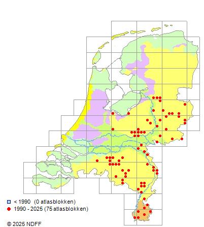 Het aantal atlasblokken (5x5 km) waarin de soort is gemeld binnen een periode van vijf jaar (vanaf 1980) of twintig jaar. Niet gecorrigeerd voor waarnemersinspanning en het aantal doorgegeven waarnemingen kan sterk variëren per periode, dus een trend in verspreiding kan hier niet direct uit worden afgelezen. Het opgegeven jaartal is het eerste jaar van de periode. Bron: gevalideerde waarnemingen uit de NDFF.