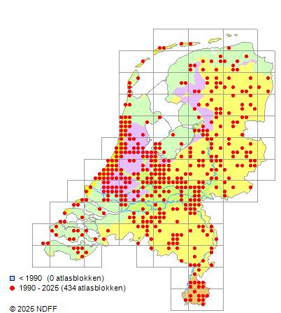 Het aantal atlasblokken (5x5 km) waarin de soort is gemeld binnen een periode van vijf jaar (vanaf 1980) of twintig jaar. Niet gecorrigeerd voor waarnemersinspanning en het aantal doorgegeven waarnemingen kan sterk variëren per periode, dus een trend in verspreiding kan hier niet direct uit worden afgelezen. Het opgegeven jaartal is het eerste jaar van de periode. Bron: gevalideerde waarnemingen uit de NDFF.
