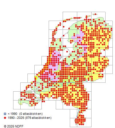Het aantal atlasblokken (5x5 km) waarin de soort is gemeld binnen een periode van vijf jaar (vanaf 1980) of twintig jaar. Niet gecorrigeerd voor waarnemersinspanning en het aantal doorgegeven waarnemingen kan sterk variëren per periode, dus een trend in verspreiding kan hier niet direct uit worden afgelezen. Het opgegeven jaartal is het eerste jaar van de periode. Bron: gevalideerde waarnemingen uit de NDFF.