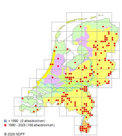 Het aantal atlasblokken (5x5 km) waarin de soort is gemeld binnen een periode van vijf jaar (vanaf 1980) of twintig jaar. Niet gecorrigeerd voor waarnemersinspanning en het aantal doorgegeven waarnemingen kan sterk variëren per periode, dus een trend in verspreiding kan hier niet direct uit worden afgelezen. Het opgegeven jaartal is het eerste jaar van de periode. Bron: gevalideerde waarnemingen uit de NDFF.