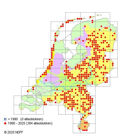 Het aantal atlasblokken (5x5 km) waarin de soort is gemeld binnen een periode van vijf jaar (vanaf 1980) of twintig jaar. Niet gecorrigeerd voor waarnemersinspanning en het aantal doorgegeven waarnemingen kan sterk variëren per periode, dus een trend in verspreiding kan hier niet direct uit worden afgelezen. Het opgegeven jaartal is het eerste jaar van de periode. Bron: gevalideerde waarnemingen uit de NDFF.