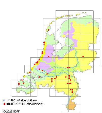 Het aantal atlasblokken (5x5 km) waarin de soort is gemeld binnen een periode van vijf jaar (vanaf 1980) of twintig jaar. Niet gecorrigeerd voor waarnemersinspanning en het aantal doorgegeven waarnemingen kan sterk variëren per periode, dus een trend in verspreiding kan hier niet direct uit worden afgelezen. Het opgegeven jaartal is het eerste jaar van de periode. Bron: gevalideerde waarnemingen uit de NDFF.