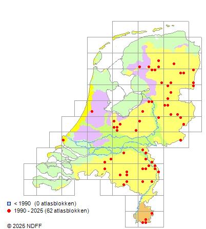 Het aantal atlasblokken (5x5 km) waarin de soort is gemeld binnen een periode van vijf jaar (vanaf 1980) of twintig jaar. Niet gecorrigeerd voor waarnemersinspanning en het aantal doorgegeven waarnemingen kan sterk variëren per periode, dus een trend in verspreiding kan hier niet direct uit worden afgelezen. Het opgegeven jaartal is het eerste jaar van de periode. Bron: gevalideerde waarnemingen uit de NDFF.