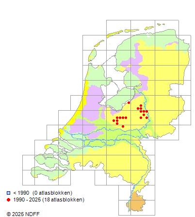 Het aantal atlasblokken (5x5 km) waarin de soort is gemeld binnen een periode van vijf jaar (vanaf 1980) of twintig jaar. Niet gecorrigeerd voor waarnemersinspanning en het aantal doorgegeven waarnemingen kan sterk variëren per periode, dus een trend in verspreiding kan hier niet direct uit worden afgelezen. Het opgegeven jaartal is het eerste jaar van de periode. Bron: gevalideerde waarnemingen uit de NDFF.