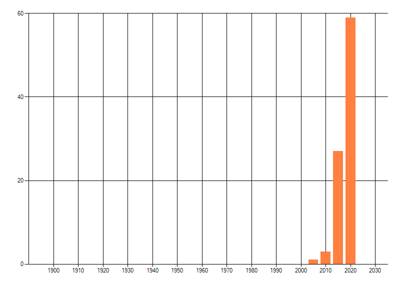 Het aantal atlasblokken (5x5 km) waarin de soort is gemeld binnen een periode van vijf jaar (vanaf 1980) of twintig jaar. Niet gecorrigeerd voor waarnemersinspanning en het aantal doorgegeven waarnemingen kan sterk variëren per periode, dus een trend in verspreiding kan hier niet direct uit worden afgelezen. Het opgegeven jaartal is het eerste jaar van de periode. Bron: gevalideerde waarnemingen uit de NDFF.
