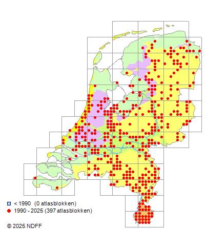 Het aantal atlasblokken (5x5 km) waarin de soort is gemeld binnen een periode van vijf jaar (vanaf 1980) of twintig jaar. Niet gecorrigeerd voor waarnemersinspanning en het aantal doorgegeven waarnemingen kan sterk variëren per periode, dus een trend in verspreiding kan hier niet direct uit worden afgelezen. Het opgegeven jaartal is het eerste jaar van de periode. Bron: gevalideerde waarnemingen uit de NDFF.