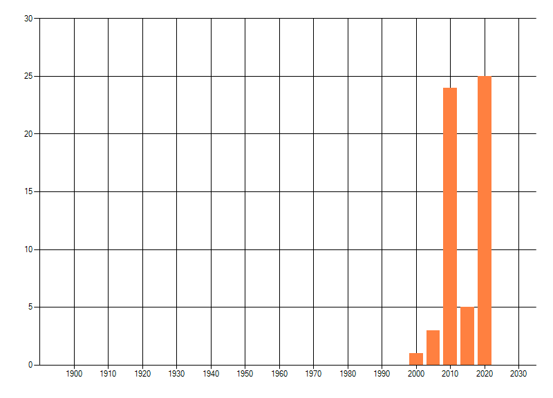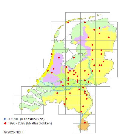 Het aantal atlasblokken (5x5 km) waarin de soort is gemeld binnen een periode van vijf jaar (vanaf 1980) of twintig jaar. Niet gecorrigeerd voor waarnemersinspanning en het aantal doorgegeven waarnemingen kan sterk variëren per periode, dus een trend in verspreiding kan hier niet direct uit worden afgelezen. Het opgegeven jaartal is het eerste jaar van de periode. Bron: gevalideerde waarnemingen uit de NDFF.