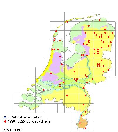 Het aantal atlasblokken (5x5 km) waarin de soort is gemeld binnen een periode van vijf jaar (vanaf 1980) of twintig jaar. Niet gecorrigeerd voor waarnemersinspanning en het aantal doorgegeven waarnemingen kan sterk variëren per periode, dus een trend in verspreiding kan hier niet direct uit worden afgelezen. Het opgegeven jaartal is het eerste jaar van de periode. Bron: gevalideerde waarnemingen uit de NDFF.