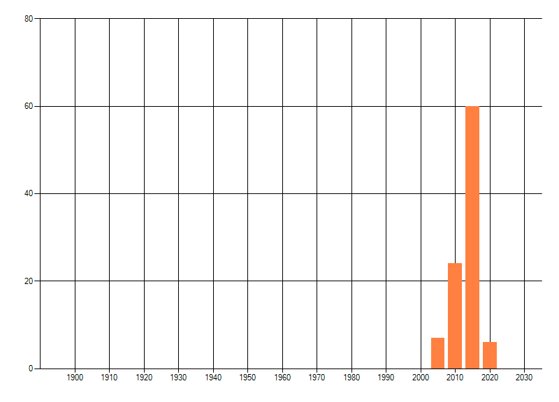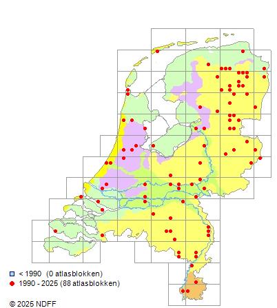 Het aantal atlasblokken (5x5 km) waarin de soort is gemeld binnen een periode van vijf jaar (vanaf 1980) of twintig jaar. Niet gecorrigeerd voor waarnemersinspanning en het aantal doorgegeven waarnemingen kan sterk variëren per periode, dus een trend in verspreiding kan hier niet direct uit worden afgelezen. Het opgegeven jaartal is het eerste jaar van de periode. Bron: gevalideerde waarnemingen uit de NDFF.