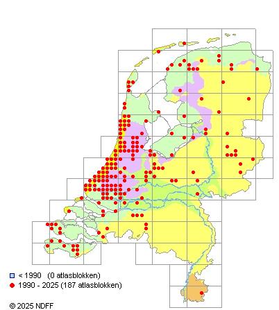 Het aantal atlasblokken (5x5 km) waarin de soort is gemeld binnen een periode van vijf jaar (vanaf 1980) of twintig jaar. Niet gecorrigeerd voor waarnemersinspanning en het aantal doorgegeven waarnemingen kan sterk variëren per periode, dus een trend in verspreiding kan hier niet direct uit worden afgelezen. Het opgegeven jaartal is het eerste jaar van de periode. Bron: gevalideerde waarnemingen uit de NDFF.