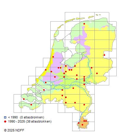 Het aantal atlasblokken (5x5 km) waarin de soort is gemeld binnen een periode van vijf jaar (vanaf 1980) of twintig jaar. Niet gecorrigeerd voor waarnemersinspanning en het aantal doorgegeven waarnemingen kan sterk variëren per periode, dus een trend in verspreiding kan hier niet direct uit worden afgelezen. Het opgegeven jaartal is het eerste jaar van de periode. Bron: gevalideerde waarnemingen uit de NDFF.