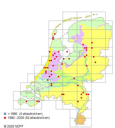 Het aantal atlasblokken (5x5 km) waarin de soort is gemeld binnen een periode van vijf jaar (vanaf 1980) of twintig jaar. Niet gecorrigeerd voor waarnemersinspanning en het aantal doorgegeven waarnemingen kan sterk variëren per periode, dus een trend in verspreiding kan hier niet direct uit worden afgelezen. Het opgegeven jaartal is het eerste jaar van de periode. Bron: gevalideerde waarnemingen uit de NDFF.