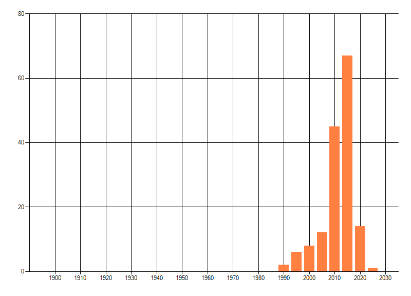 Het aantal atlasblokken (5x5 km) waarin de soort is gemeld binnen een periode van vijf jaar (vanaf 1980) of twintig jaar. Niet gecorrigeerd voor waarnemersinspanning en het aantal doorgegeven waarnemingen kan sterk variëren per periode, dus een trend in verspreiding kan hier niet direct uit worden afgelezen. Het opgegeven jaartal is het eerste jaar van de periode. Bron: gevalideerde waarnemingen uit de NDFF.