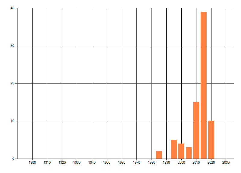 Het aantal atlasblokken (5x5 km) waarin de soort is gemeld binnen een periode van vijf jaar (vanaf 1980) of twintig jaar. Niet gecorrigeerd voor waarnemersinspanning en het aantal doorgegeven waarnemingen kan sterk variëren per periode, dus een trend in verspreiding kan hier niet direct uit worden afgelezen. Het opgegeven jaartal is het eerste jaar van de periode. Bron: gevalideerde waarnemingen uit de NDFF.