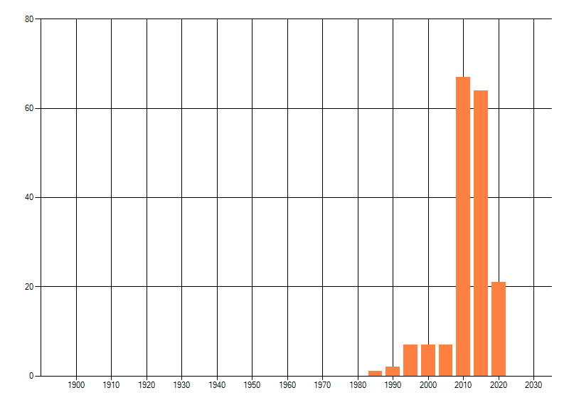 Het aantal atlasblokken (5x5 km) waarin de soort is gemeld binnen een periode van vijf jaar (vanaf 1980) of twintig jaar. Niet gecorrigeerd voor waarnemersinspanning en het aantal doorgegeven waarnemingen kan sterk variëren per periode, dus een trend in verspreiding kan hier niet direct uit worden afgelezen. Het opgegeven jaartal is het eerste jaar van de periode. Bron: gevalideerde waarnemingen uit de NDFF.