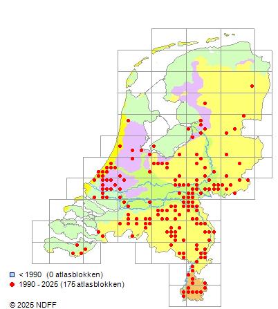 Het aantal atlasblokken (5x5 km) waarin de soort is gemeld binnen een periode van vijf jaar (vanaf 1980) of twintig jaar. Niet gecorrigeerd voor waarnemersinspanning en het aantal doorgegeven waarnemingen kan sterk variëren per periode, dus een trend in verspreiding kan hier niet direct uit worden afgelezen. Het opgegeven jaartal is het eerste jaar van de periode. Bron: gevalideerde waarnemingen uit de NDFF.