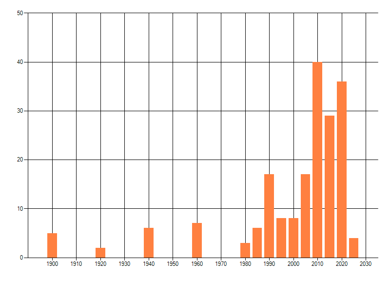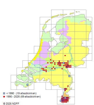 Het aantal atlasblokken (5x5 km) waarin de soort is gemeld binnen een periode van vijf jaar (vanaf 1980) of twintig jaar. Niet gecorrigeerd voor waarnemersinspanning en het aantal doorgegeven waarnemingen kan sterk variëren per periode, dus een trend in verspreiding kan hier niet direct uit worden afgelezen. Het opgegeven jaartal is het eerste jaar van de periode. Bron: gevalideerde waarnemingen uit de NDFF.