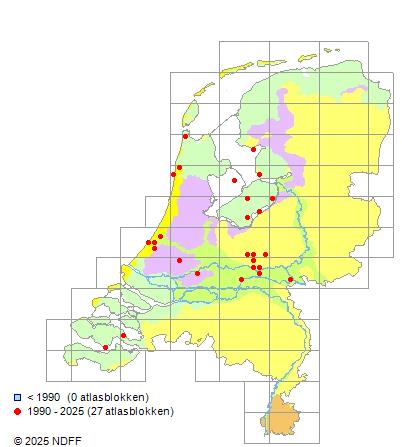 Het aantal atlasblokken (5x5 km) waarin de soort is gemeld binnen een periode van vijf jaar (vanaf 1980) of twintig jaar. Niet gecorrigeerd voor waarnemersinspanning en het aantal doorgegeven waarnemingen kan sterk variëren per periode, dus een trend in verspreiding kan hier niet direct uit worden afgelezen. Het opgegeven jaartal is het eerste jaar van de periode. Bron: gevalideerde waarnemingen uit de NDFF.