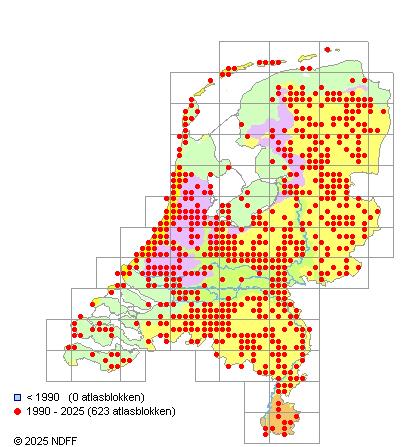 Het aantal atlasblokken (5x5 km) waarin de soort is gemeld binnen een periode van vijf jaar (vanaf 1980) of twintig jaar. Niet gecorrigeerd voor waarnemersinspanning en het aantal doorgegeven waarnemingen kan sterk variëren per periode, dus een trend in verspreiding kan hier niet direct uit worden afgelezen. Het opgegeven jaartal is het eerste jaar van de periode. Bron: gevalideerde waarnemingen uit de NDFF.