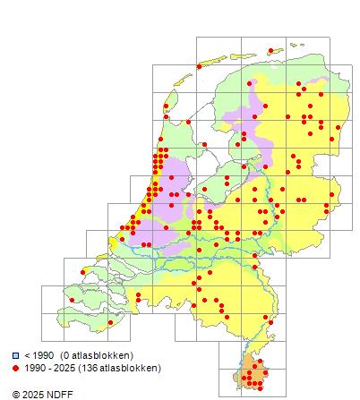 Het aantal atlasblokken (5x5 km) waarin de soort is gemeld binnen een periode van vijf jaar (vanaf 1980) of twintig jaar. Niet gecorrigeerd voor waarnemersinspanning en het aantal doorgegeven waarnemingen kan sterk variëren per periode, dus een trend in verspreiding kan hier niet direct uit worden afgelezen. Het opgegeven jaartal is het eerste jaar van de periode. Bron: gevalideerde waarnemingen uit de NDFF.