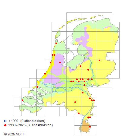 Het aantal atlasblokken (5x5 km) waarin de soort is gemeld binnen een periode van vijf jaar (vanaf 1980) of twintig jaar. Niet gecorrigeerd voor waarnemersinspanning en het aantal doorgegeven waarnemingen kan sterk variëren per periode, dus een trend in verspreiding kan hier niet direct uit worden afgelezen. Het opgegeven jaartal is het eerste jaar van de periode. Bron: gevalideerde waarnemingen uit de NDFF.