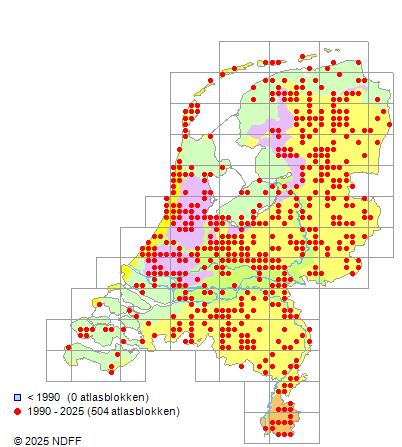Het aantal atlasblokken (5x5 km) waarin de soort is gemeld binnen een periode van vijf jaar (vanaf 1980) of twintig jaar. Niet gecorrigeerd voor waarnemersinspanning en het aantal doorgegeven waarnemingen kan sterk variëren per periode, dus een trend in verspreiding kan hier niet direct uit worden afgelezen. Het opgegeven jaartal is het eerste jaar van de periode. Bron: gevalideerde waarnemingen uit de NDFF.