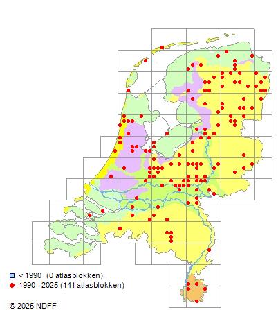 Het aantal atlasblokken (5x5 km) waarin de soort is gemeld binnen een periode van vijf jaar (vanaf 1980) of twintig jaar. Niet gecorrigeerd voor waarnemersinspanning en het aantal doorgegeven waarnemingen kan sterk variëren per periode, dus een trend in verspreiding kan hier niet direct uit worden afgelezen. Het opgegeven jaartal is het eerste jaar van de periode. Bron: gevalideerde waarnemingen uit de NDFF.