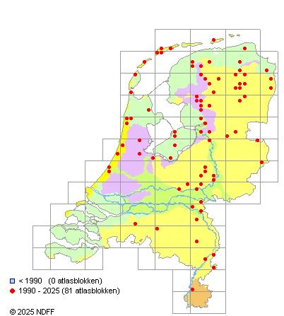 Het aantal atlasblokken (5x5 km) waarin de soort is gemeld binnen een periode van vijf jaar (vanaf 1980) of twintig jaar. Niet gecorrigeerd voor waarnemersinspanning en het aantal doorgegeven waarnemingen kan sterk variëren per periode, dus een trend in verspreiding kan hier niet direct uit worden afgelezen. Het opgegeven jaartal is het eerste jaar van de periode. Bron: gevalideerde waarnemingen uit de NDFF.