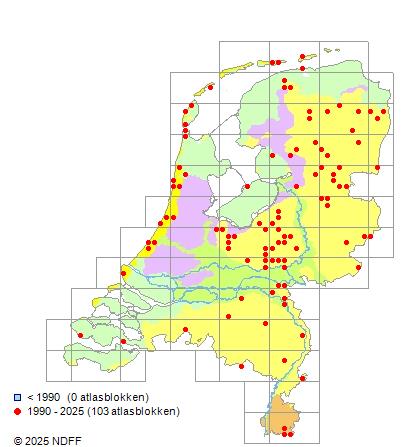 Het aantal atlasblokken (5x5 km) waarin de soort is gemeld binnen een periode van vijf jaar (vanaf 1980) of twintig jaar. Niet gecorrigeerd voor waarnemersinspanning en het aantal doorgegeven waarnemingen kan sterk variëren per periode, dus een trend in verspreiding kan hier niet direct uit worden afgelezen. Het opgegeven jaartal is het eerste jaar van de periode. Bron: gevalideerde waarnemingen uit de NDFF.