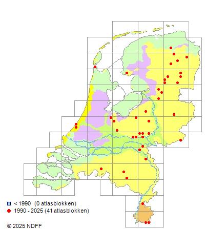 Het aantal atlasblokken (5x5 km) waarin de soort is gemeld binnen een periode van vijf jaar (vanaf 1980) of twintig jaar. Niet gecorrigeerd voor waarnemersinspanning en het aantal doorgegeven waarnemingen kan sterk variëren per periode, dus een trend in verspreiding kan hier niet direct uit worden afgelezen. Het opgegeven jaartal is het eerste jaar van de periode. Bron: gevalideerde waarnemingen uit de NDFF.