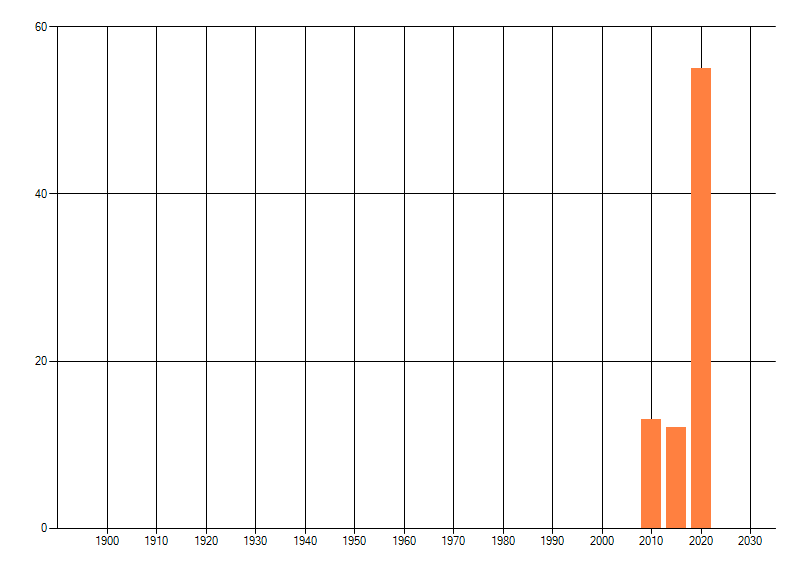Het aantal atlasblokken (5x5 km) waarin de soort is gemeld binnen een periode van vijf jaar (vanaf 1980) of twintig jaar. Niet gecorrigeerd voor waarnemersinspanning en het aantal doorgegeven waarnemingen kan sterk variëren per periode, dus een trend in verspreiding kan hier niet direct uit worden afgelezen. Het opgegeven jaartal is het eerste jaar van de periode. Bron: gevalideerde waarnemingen uit de NDFF.