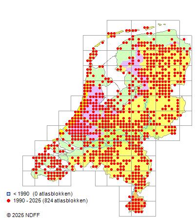 Het aantal atlasblokken (5x5 km) waarin de soort is gemeld binnen een periode van vijf jaar (vanaf 1980) of twintig jaar. Niet gecorrigeerd voor waarnemersinspanning en het aantal doorgegeven waarnemingen kan sterk variëren per periode, dus een trend in verspreiding kan hier niet direct uit worden afgelezen. Het opgegeven jaartal is het eerste jaar van de periode. Bron: gevalideerde waarnemingen uit de NDFF.