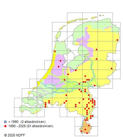 Het aantal atlasblokken (5x5 km) waarin de soort is gemeld binnen een periode van vijf jaar (vanaf 1980) of twintig jaar. Niet gecorrigeerd voor waarnemersinspanning en het aantal doorgegeven waarnemingen kan sterk variëren per periode, dus een trend in verspreiding kan hier niet direct uit worden afgelezen. Het opgegeven jaartal is het eerste jaar van de periode. Bron: gevalideerde waarnemingen uit de NDFF.