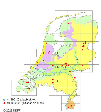 Het aantal atlasblokken (5x5 km) waarin de soort is gemeld binnen een periode van vijf jaar (vanaf 1980) of twintig jaar. Niet gecorrigeerd voor waarnemersinspanning en het aantal doorgegeven waarnemingen kan sterk variëren per periode, dus een trend in verspreiding kan hier niet direct uit worden afgelezen. Het opgegeven jaartal is het eerste jaar van de periode. Bron: gevalideerde waarnemingen uit de NDFF.