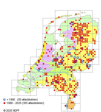 Het aantal atlasblokken (5x5 km) waarin de soort is gemeld binnen een periode van vijf jaar (vanaf 1980) of twintig jaar. Niet gecorrigeerd voor waarnemersinspanning en het aantal doorgegeven waarnemingen kan sterk variëren per periode, dus een trend in verspreiding kan hier niet direct uit worden afgelezen. Het opgegeven jaartal is het eerste jaar van de periode. Bron: gevalideerde waarnemingen uit de NDFF.