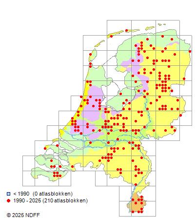 Het aantal atlasblokken (5x5 km) waarin de soort is gemeld binnen een periode van vijf jaar (vanaf 1980) of twintig jaar. Niet gecorrigeerd voor waarnemersinspanning en het aantal doorgegeven waarnemingen kan sterk variëren per periode, dus een trend in verspreiding kan hier niet direct uit worden afgelezen. Het opgegeven jaartal is het eerste jaar van de periode. Bron: gevalideerde waarnemingen uit de NDFF.