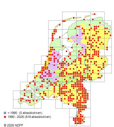 Het aantal atlasblokken (5x5 km) waarin de soort is gemeld binnen een periode van vijf jaar (vanaf 1980) of twintig jaar. Niet gecorrigeerd voor waarnemersinspanning en het aantal doorgegeven waarnemingen kan sterk variëren per periode, dus een trend in verspreiding kan hier niet direct uit worden afgelezen. Het opgegeven jaartal is het eerste jaar van de periode. Bron: gevalideerde waarnemingen uit de NDFF.