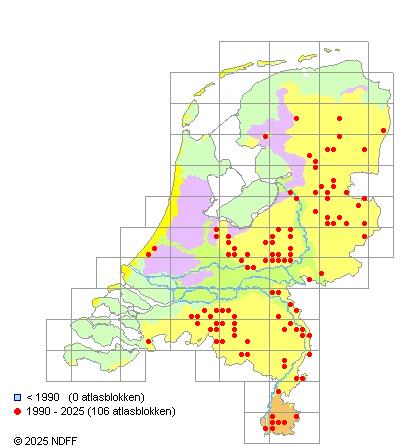 Het aantal atlasblokken (5x5 km) waarin de soort is gemeld binnen een periode van vijf jaar (vanaf 1980) of twintig jaar. Niet gecorrigeerd voor waarnemersinspanning en het aantal doorgegeven waarnemingen kan sterk variëren per periode, dus een trend in verspreiding kan hier niet direct uit worden afgelezen. Het opgegeven jaartal is het eerste jaar van de periode. Bron: gevalideerde waarnemingen uit de NDFF.