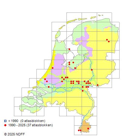 Het aantal atlasblokken (5x5 km) waarin de soort is gemeld binnen een periode van vijf jaar (vanaf 1980) of twintig jaar. Niet gecorrigeerd voor waarnemersinspanning en het aantal doorgegeven waarnemingen kan sterk variëren per periode, dus een trend in verspreiding kan hier niet direct uit worden afgelezen. Het opgegeven jaartal is het eerste jaar van de periode. Bron: gevalideerde waarnemingen uit de NDFF.