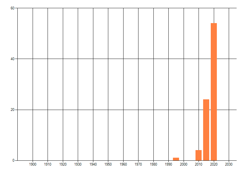 Het aantal atlasblokken (5x5 km) waarin de soort is gemeld binnen een periode van vijf jaar (vanaf 1980) of twintig jaar. Niet gecorrigeerd voor waarnemersinspanning en het aantal doorgegeven waarnemingen kan sterk variëren per periode, dus een trend in verspreiding kan hier niet direct uit worden afgelezen. Het opgegeven jaartal is het eerste jaar van de periode. Bron: gevalideerde waarnemingen uit de NDFF.