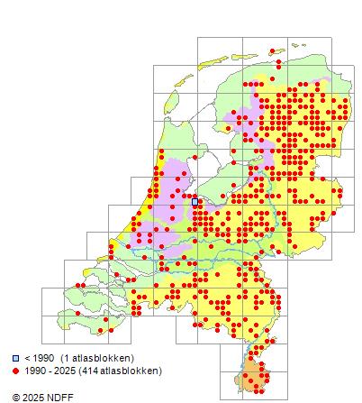 Het aantal atlasblokken (5x5 km) waarin de soort is gemeld binnen een periode van vijf jaar (vanaf 1980) of twintig jaar. Niet gecorrigeerd voor waarnemersinspanning en het aantal doorgegeven waarnemingen kan sterk variëren per periode, dus een trend in verspreiding kan hier niet direct uit worden afgelezen. Het opgegeven jaartal is het eerste jaar van de periode. Bron: gevalideerde waarnemingen uit de NDFF.