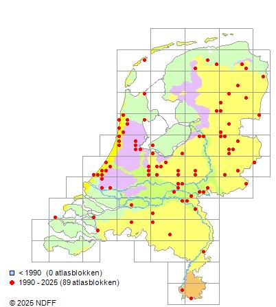 Het aantal atlasblokken (5x5 km) waarin de soort is gemeld binnen een periode van vijf jaar (vanaf 1980) of twintig jaar. Niet gecorrigeerd voor waarnemersinspanning en het aantal doorgegeven waarnemingen kan sterk variëren per periode, dus een trend in verspreiding kan hier niet direct uit worden afgelezen. Het opgegeven jaartal is het eerste jaar van de periode. Bron: gevalideerde waarnemingen uit de NDFF.