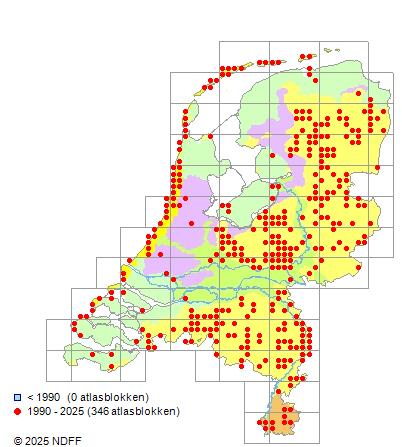 Het aantal atlasblokken (5x5 km) waarin de soort is gemeld binnen een periode van vijf jaar (vanaf 1980) of twintig jaar. Niet gecorrigeerd voor waarnemersinspanning en het aantal doorgegeven waarnemingen kan sterk variëren per periode, dus een trend in verspreiding kan hier niet direct uit worden afgelezen. Het opgegeven jaartal is het eerste jaar van de periode. Bron: gevalideerde waarnemingen uit de NDFF.