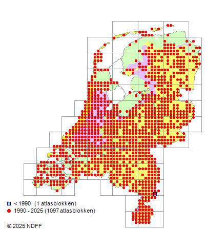 Het aantal atlasblokken (5x5 km) waarin de soort is gemeld binnen een periode van vijf jaar (vanaf 1980) of twintig jaar. Niet gecorrigeerd voor waarnemersinspanning en het aantal doorgegeven waarnemingen kan sterk variëren per periode, dus een trend in verspreiding kan hier niet direct uit worden afgelezen. Het opgegeven jaartal is het eerste jaar van de periode. Bron: gevalideerde waarnemingen uit de NDFF.