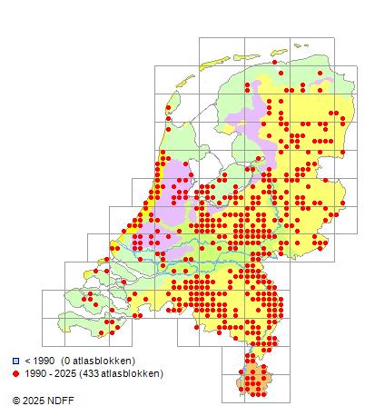 Het aantal atlasblokken (5x5 km) waarin de soort is gemeld binnen een periode van vijf jaar (vanaf 1980) of twintig jaar. Niet gecorrigeerd voor waarnemersinspanning en het aantal doorgegeven waarnemingen kan sterk variëren per periode, dus een trend in verspreiding kan hier niet direct uit worden afgelezen. Het opgegeven jaartal is het eerste jaar van de periode. Bron: gevalideerde waarnemingen uit de NDFF.
