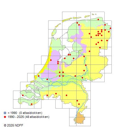 Het aantal atlasblokken (5x5 km) waarin de soort is gemeld binnen een periode van vijf jaar (vanaf 1980) of twintig jaar. Niet gecorrigeerd voor waarnemersinspanning en het aantal doorgegeven waarnemingen kan sterk variëren per periode, dus een trend in verspreiding kan hier niet direct uit worden afgelezen. Het opgegeven jaartal is het eerste jaar van de periode. Bron: gevalideerde waarnemingen uit de NDFF.