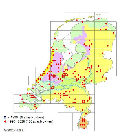Het aantal atlasblokken (5x5 km) waarin de soort is gemeld binnen een periode van vijf jaar (vanaf 1980) of twintig jaar. Niet gecorrigeerd voor waarnemersinspanning en het aantal doorgegeven waarnemingen kan sterk variëren per periode, dus een trend in verspreiding kan hier niet direct uit worden afgelezen. Het opgegeven jaartal is het eerste jaar van de periode. Bron: gevalideerde waarnemingen uit de NDFF.