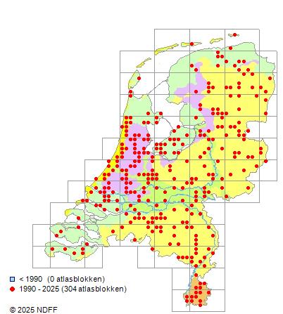 Het aantal atlasblokken (5x5 km) waarin de soort is gemeld binnen een periode van vijf jaar (vanaf 1980) of twintig jaar. Niet gecorrigeerd voor waarnemersinspanning en het aantal doorgegeven waarnemingen kan sterk variëren per periode, dus een trend in verspreiding kan hier niet direct uit worden afgelezen. Het opgegeven jaartal is het eerste jaar van de periode. Bron: gevalideerde waarnemingen uit de NDFF.